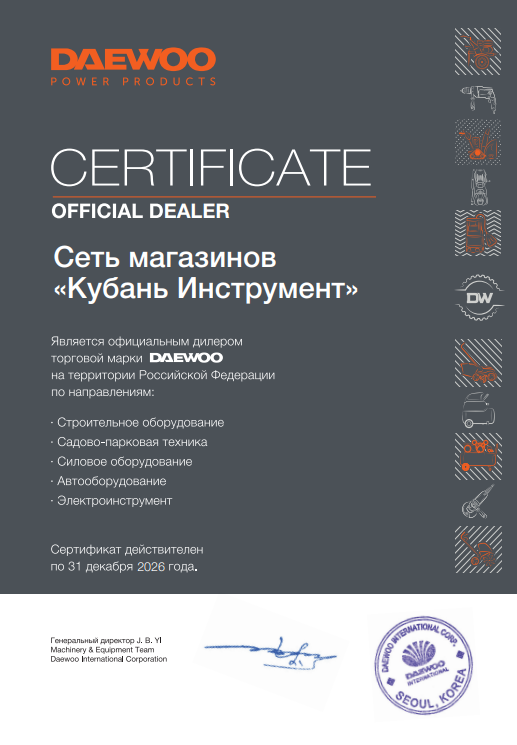 Вся продукция, представленная на российском рынке под брендом DAEWOO Power Products сертифицирована и проходит жесткий контроль на всех этапах производства. Выбирая продукцию DAEWOO Вы присоединяетесь к многомиллионному сообществу потребителей нового поколения, ориентированных на рациональный выбор, ценящих свое время и деньги, следующих передовым тенденциям развития технологий и дизайна.