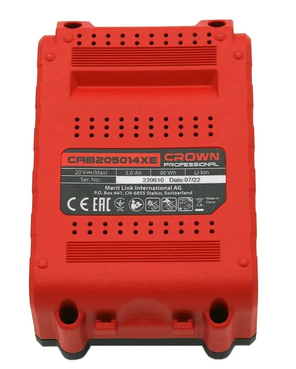 - • аккумулятор CROWN CAB205014XE 20В, 5.0Ач, ячейки 18650.