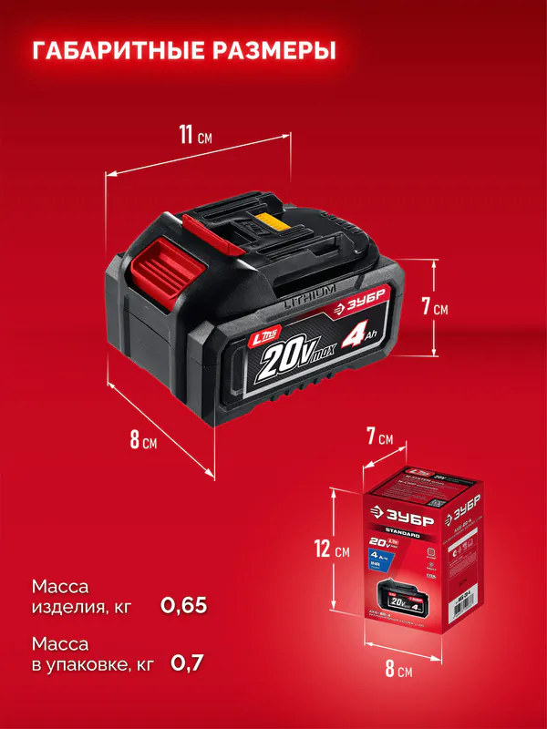 - ЗУБР 20 В, 4.0 А·ч, аккумулятор LMS (АКБ-20-4)
