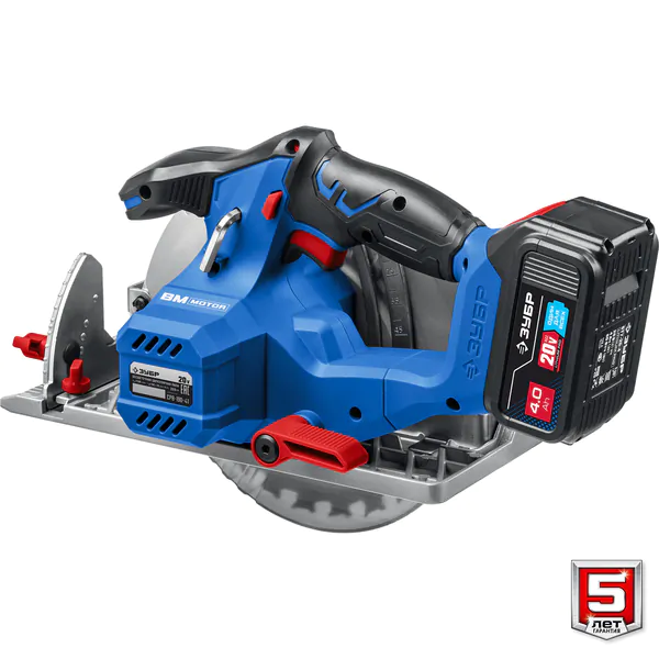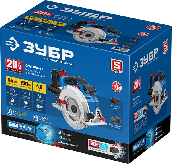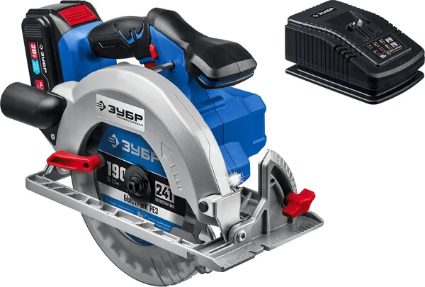 - ЗУБР Т7, 20 В, d190 мм, 1 АКБ (4 А·ч), бесщеточная пила циркулярная, Профессионал (CPB-190-41)