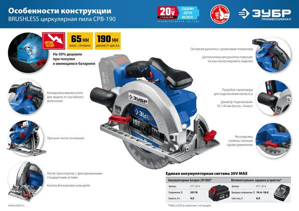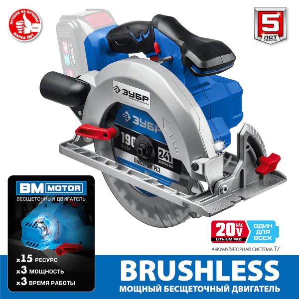 - ЗУБР Т7, 20 В, d190 мм, без АКБ, бесщеточная пила циркулярная, Профессионал (CPB-190)
