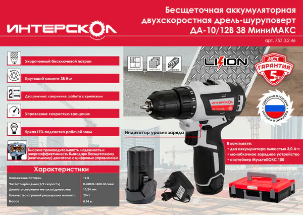Аккумуляторная дрель-шуруповерт Интерскол ДА-10/12В 38 МиниМАКС 757.3.2.46