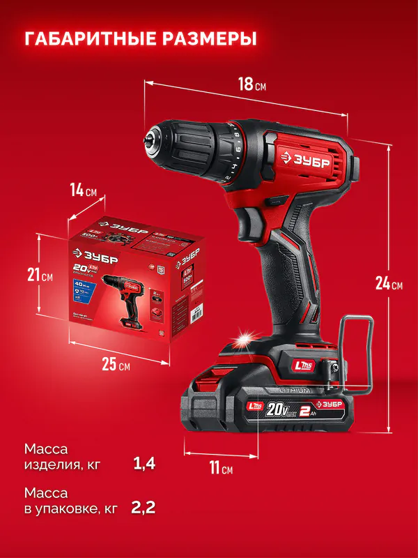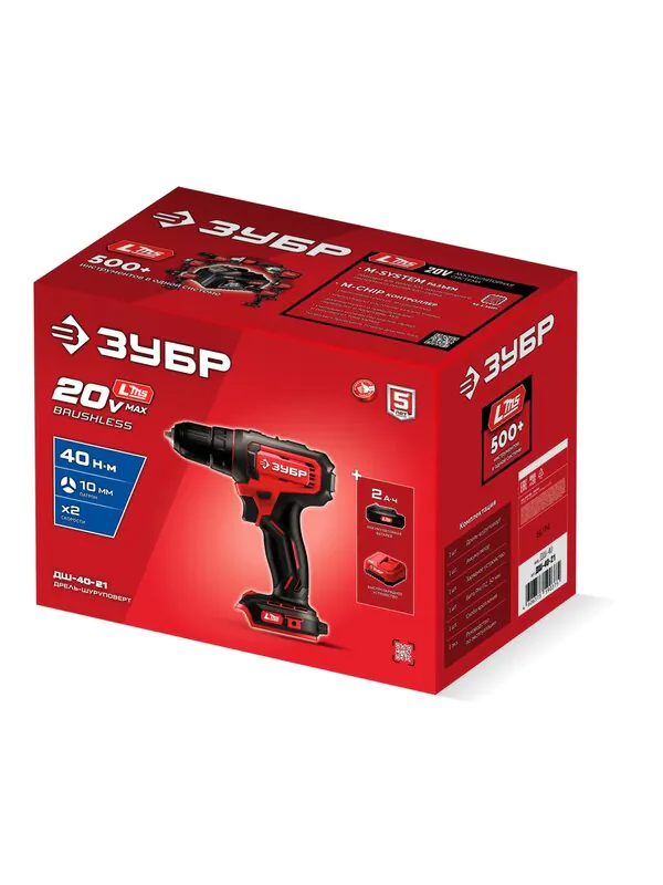 - ЗУБР 20 В, 40 Н·м, 1 АКБ LMS (2 А·ч), дрель-шуруповерт (ДШ-40-21)