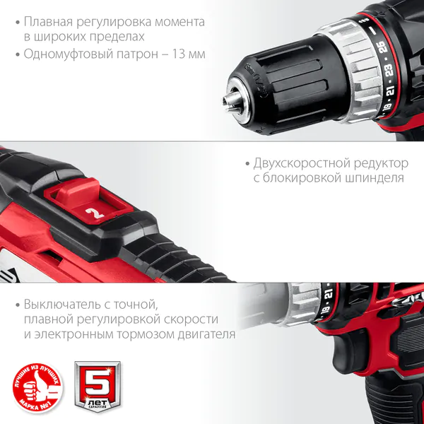 Напряжение аккумулятора, ВЕмкость аккумулятора, А*ч2Размер зажимаемой оснастки, ммТип аккумулятораТип двигателяMax диаметр сверления (металл), мм12Max диаметр сверления (дерево), мм28Частота вращения шпинделя, об/мин0-400/0-1400Количество аккумуляторов в комплектеУстройство аккумулятораЧисло ступеней крутящего моментаНаличие подсветкиДаТип патронаЧисло скоростейМягкий вращающий момент, Нм18Режим удараНетРеверсТормоз двигателяДаУсловия гарантии60 месяцевИндикатор заряда батареиДаУпаковкаЭлектронная регулировка оборотовДаБлокировка шпинделяДаВремя заряда, Ч1Max жесткий вращающий момент, Нм40Зарядное устройствоЗащита от удараНетНапряжение питания зарядного устройства, В/ГцАккумуляторная платформаЭлектронная защита от перегрузокДаПроизводительЗУБРГабариты товара (ДхШхВ), мм310*110*110Масса нетто, кг3.66