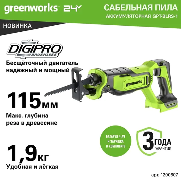 Аккумуляторная сабельная пила Greenworks GPT-BLRS-1, 24V 1*4Ач,ЗУ 1200607CUB