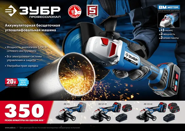 - ЗУБР Т7, 20 В, 125 мм, без АКБ, бесщеточная УШМ, Профессионал (AB-125)