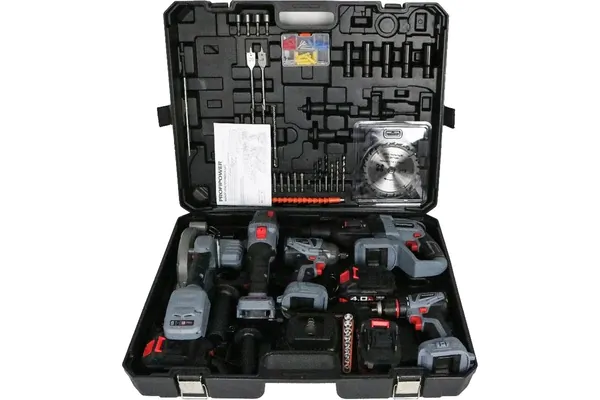Аккумуляторный бесщеточный набор 5в1 PROFIPOWER ProfiSet-5F18 (Li-ion-3шт, 4Ач, З/У, кейс, E0080, E0081,T0058, T0056, E0188) E0267