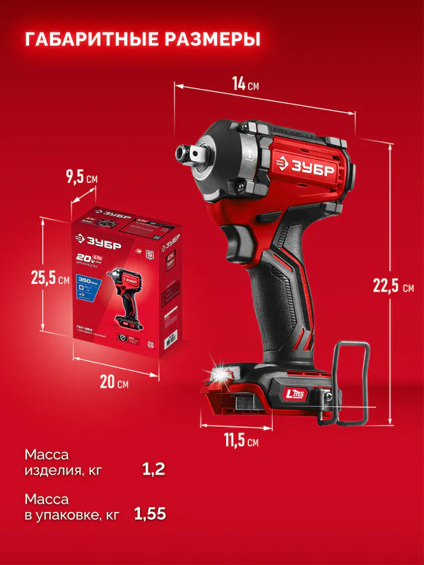- ЗУБР 20 В, 350 Н·м, без АКБ (LMS), бесщеточный ударный гайковерт (ГБУ-350)