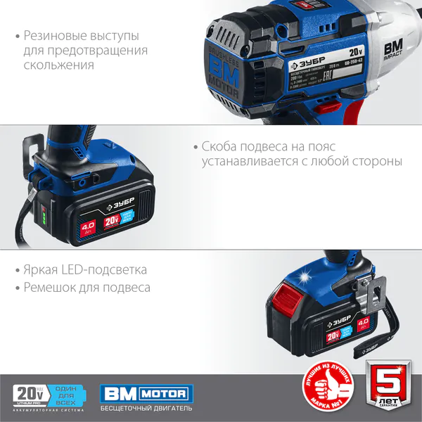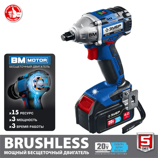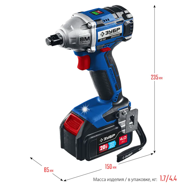 Аккумуляторный гайковерт Зубр Профессионал бесщеточный 2 АКБ 4Ач , 20В, в кейсе GB-250-42