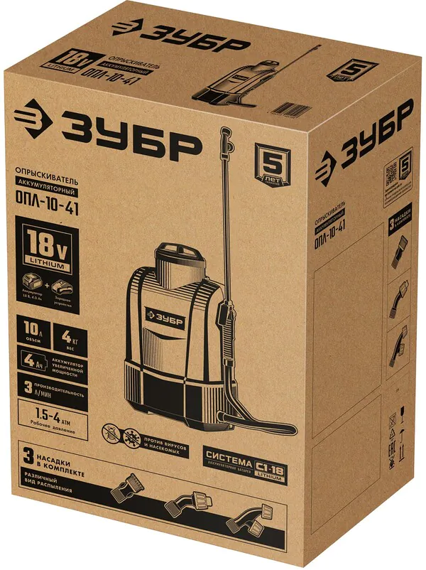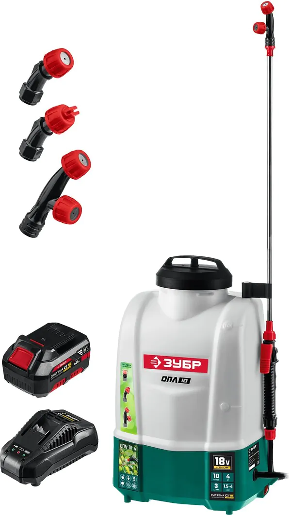 - ЗУБР 10 л, 1 АКБ 4 А·ч, аккумуляторный опрыскиватель (ОПЛ-10-41)