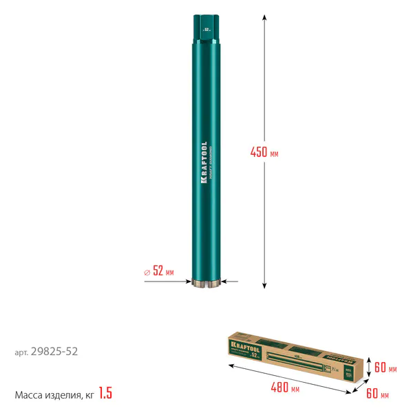 Алмазная коронка по железобетону Kraftool DIAMOND 52мм 450мм, 1 1/4″, лазерная сварка сегментов 29825-052