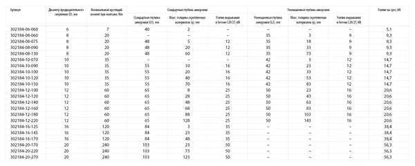 Максимальная толщина скрепляемых материалов при стандартной глубине анкеровки, мм: