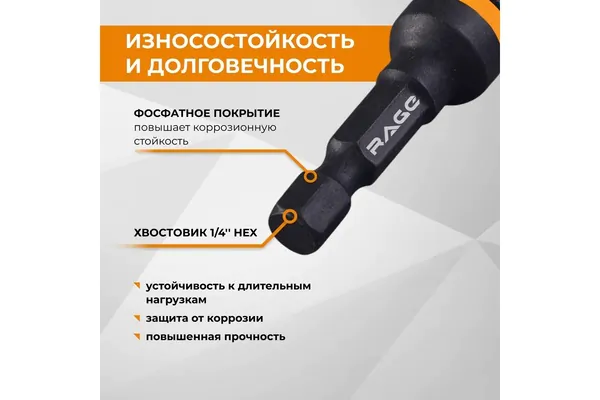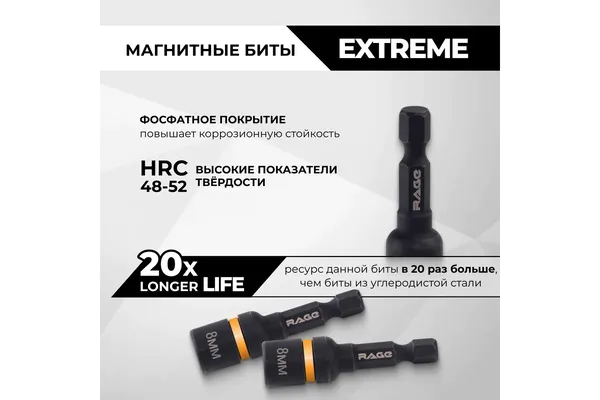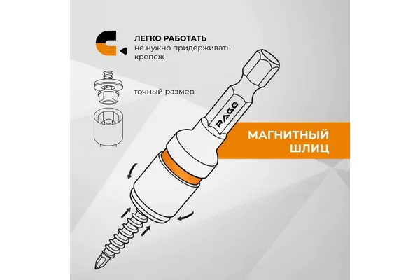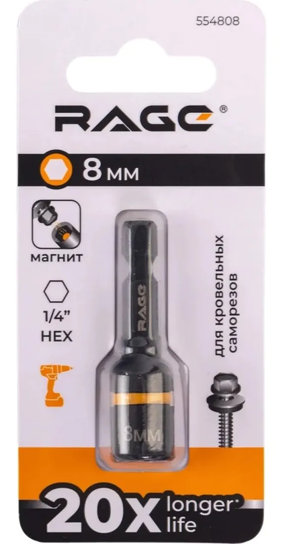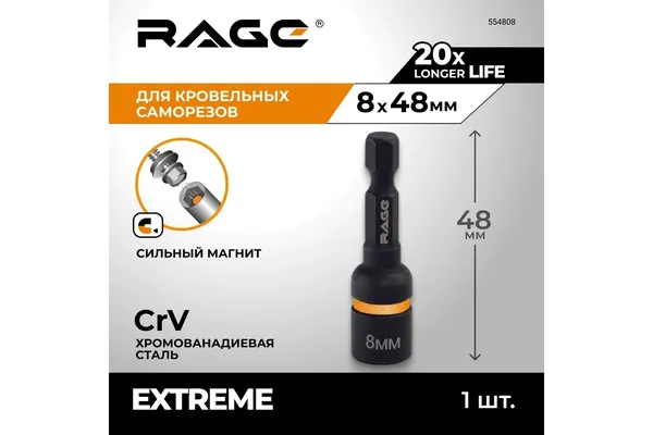 - • бита RAGE для кровельных саморезов 8*48 мм CrV HEX 554808.