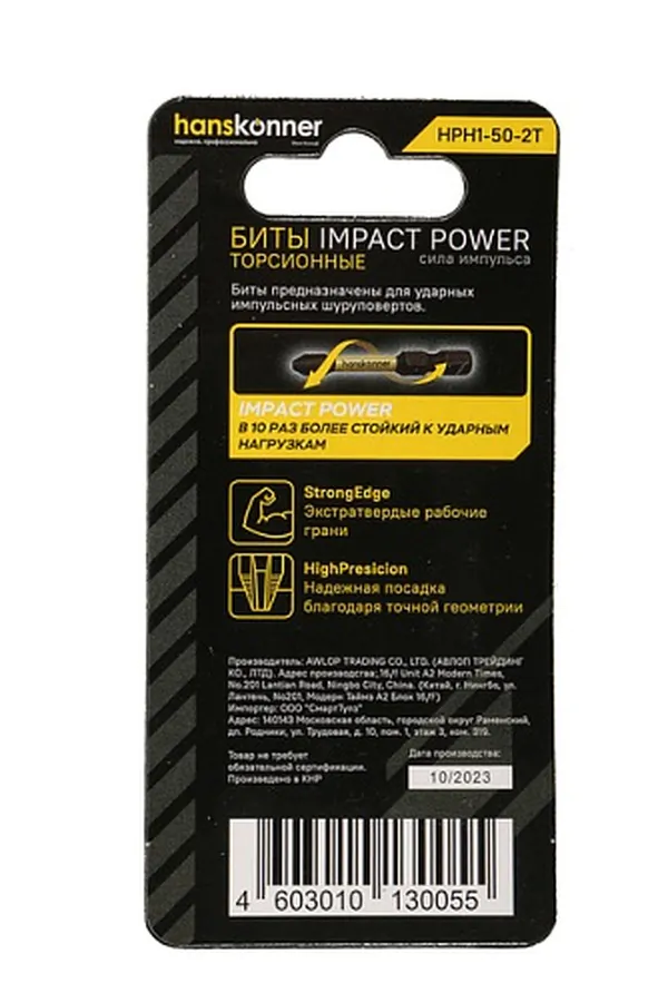 Биты Hanskonner PH1x50мм, ImpactPower, торсионные, 2шт, HPH1-50-2T