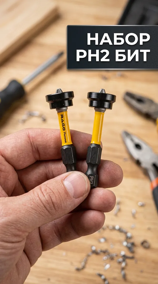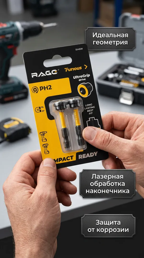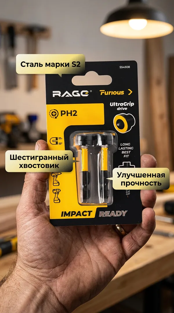 - • биты торсионные RAGE Furious S2 PH2 50 мм 2 шт для гипсокартона и ГВЛ 554508.