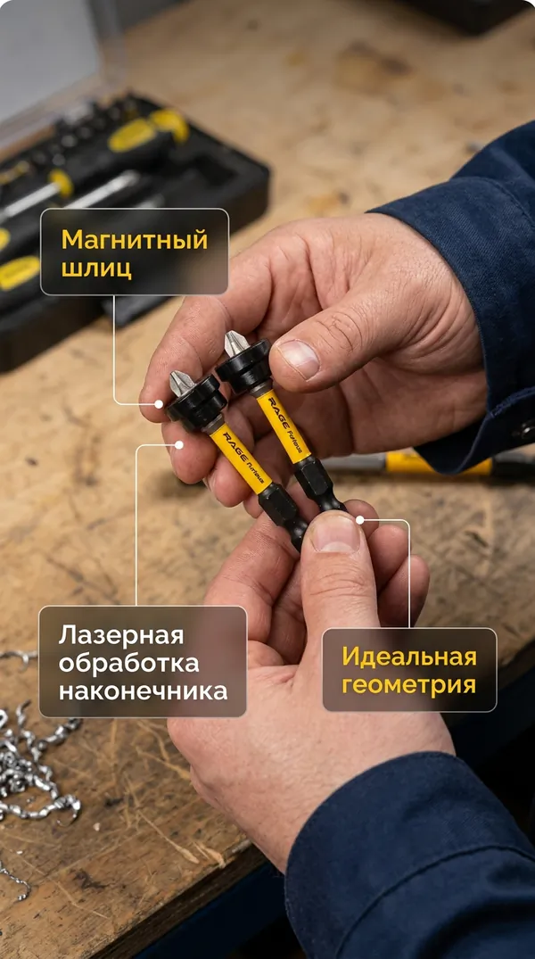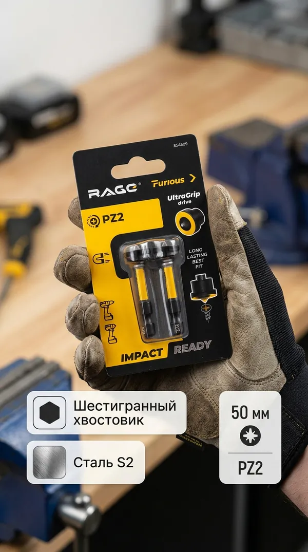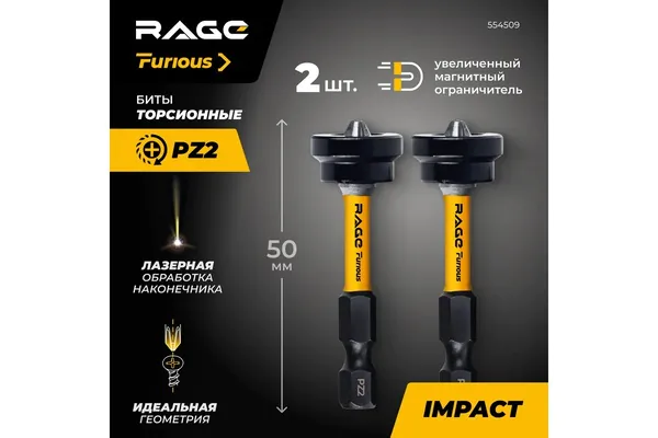 - • биты торсионные RAGE Furious S2 PZ2 50 мм 2 шт для гипсокартона и ГВЛ 554509.