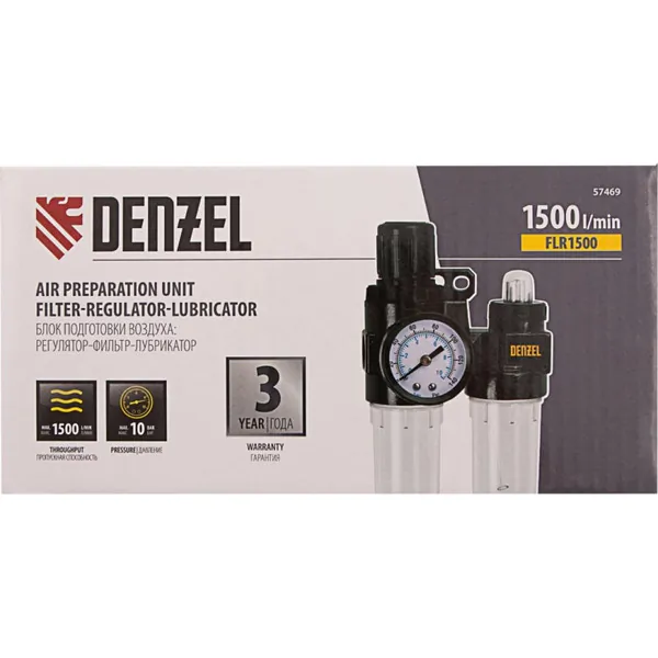 - • блок подготовки воздуха регулятор-фильтр-лубрикатор Denzel FLR1500, 10 бар, 1500 л/мин, 1/4" 57469;