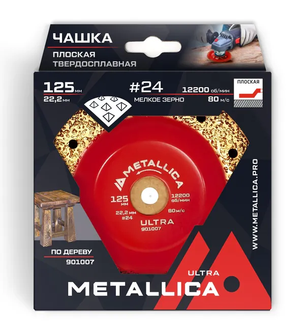 - • чашка твердосплавная шлифовальная METALLICA Ultra 125*22,2мм, #24, плоская, (по дереву) 901007.