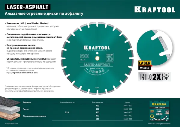 - KRAFTOOL LASER-ASPHALT 450 мм (25.4/20 мм, 10х4.0 мм), алмазный диск (36687-450)