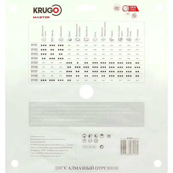 Диаметр диска, ммПосадочный диаметрТип резаТолщина алмазного слоя, ммМатериал обработкиКоличество сегментов, шт18ПроизводительKrugoФасовка, шт1Гарантия, месНе предоставляетсяУсловия гарантиина расходные материалыРодина брендаКитайская Народная Республика [КНР]Тип дискаВысота алмазного слоя, мм12Страна изготовительКитайФорма кругаМодель81053000254Число оборотов, об/минГабариты товара (ДхШхВ), мм300*70*300Масса нетто, кг1.1Габариты упаковки (ДхШхВ), мм380*70*350Вес брутто, кг1.3Комплектация