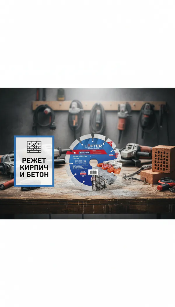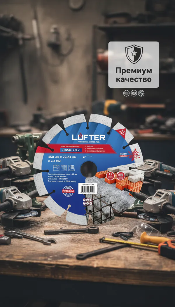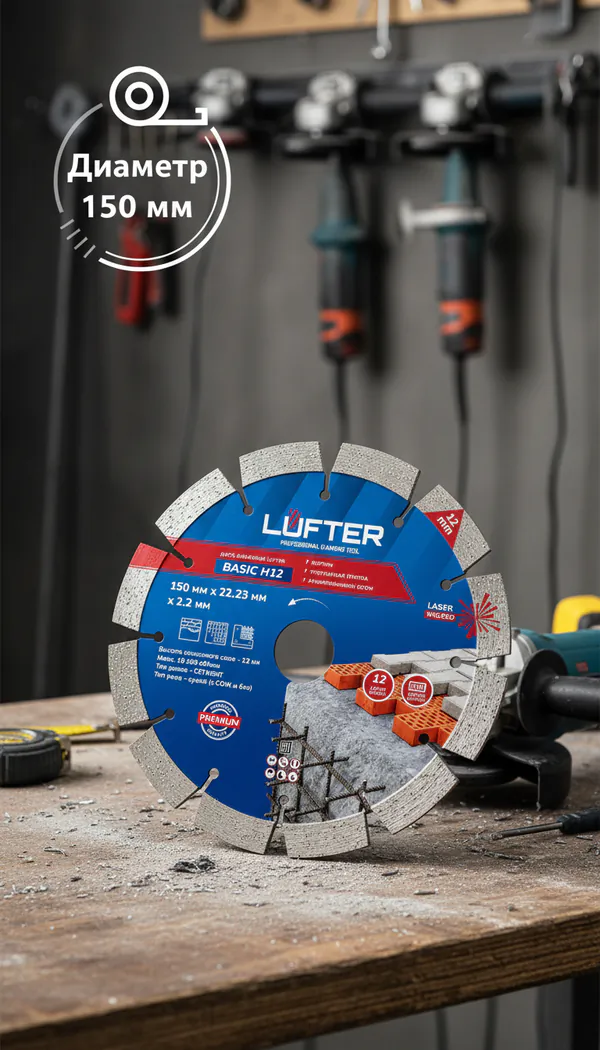 - • диск алмазный сегментный LUFTER BASIC H12 150*22.23*2.2 мм (кирпич, тротуарная плитка, армированный бетон) 002-150.