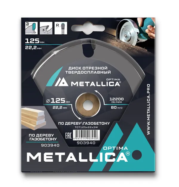- • диск отрезной твердосплавный METALLICA Optima 125*22,2 мм 3 зуба, Т=3,8 мм по дереву 903940.