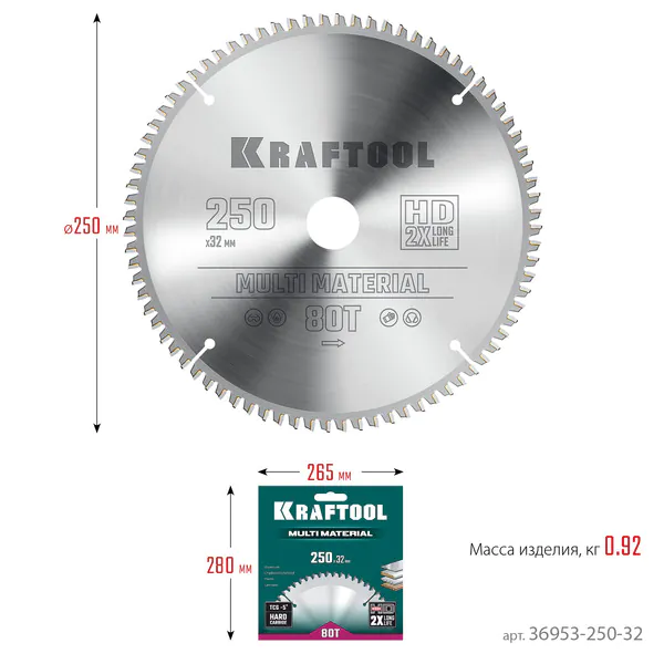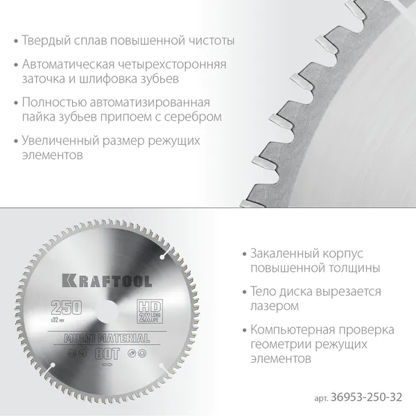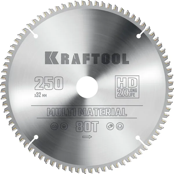 - KRAFTOOL Multi Material, 250 х 32 мм, 80Т, пильный диск по алюминию (36953-250-32)