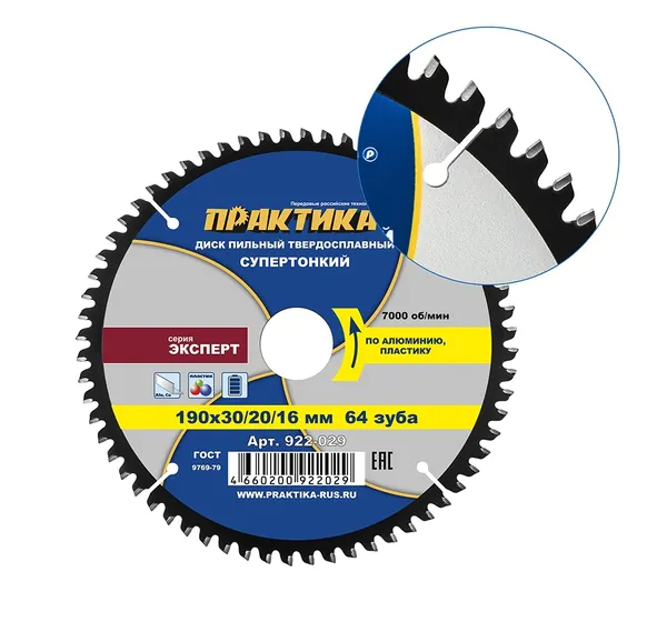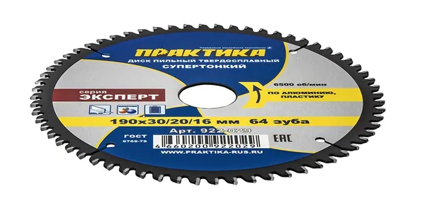 - • диск пильный по алюминию Практика 190*30\20\16 мм тонкий, 64 зуба 922-029.
