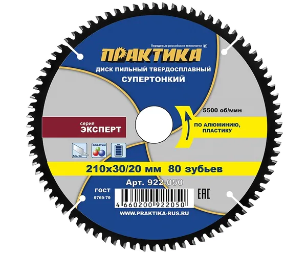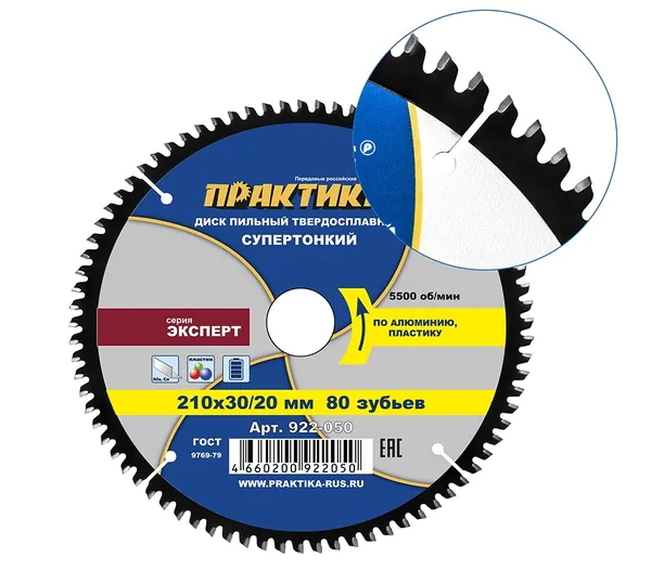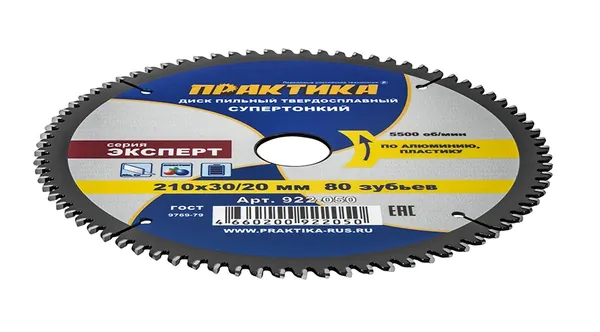- • диск пильный по алюминию Практика 210*30\20 мм, тонкий, 80 зубьев 922-050.
