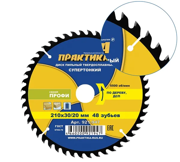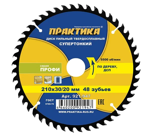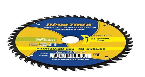 - • диск пильный по дереву и ДСП Практика 210*30\20 мм, тонкий, 48 зубьев 921-947.