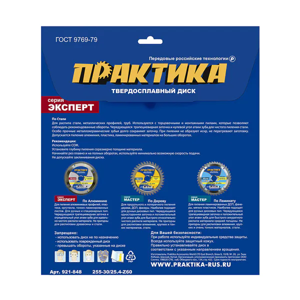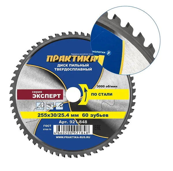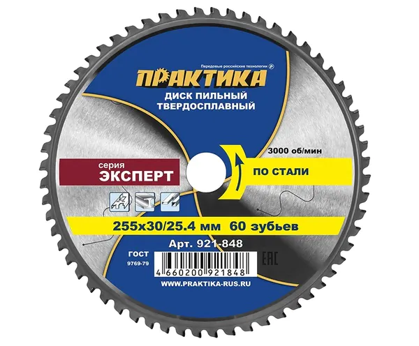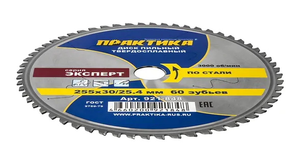 - • диск пильный по стали ПРАКТИКА 255*30\25,4мм 60 зубьев 921-848.
