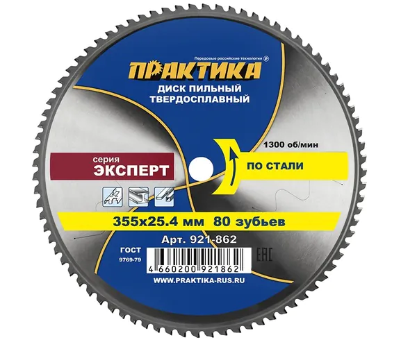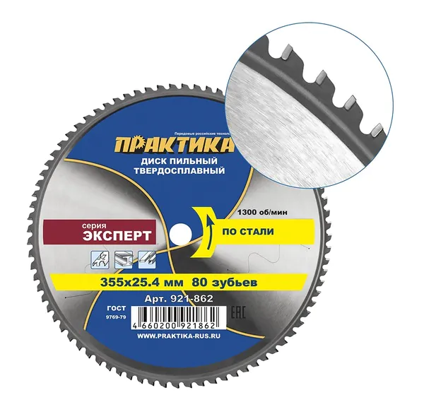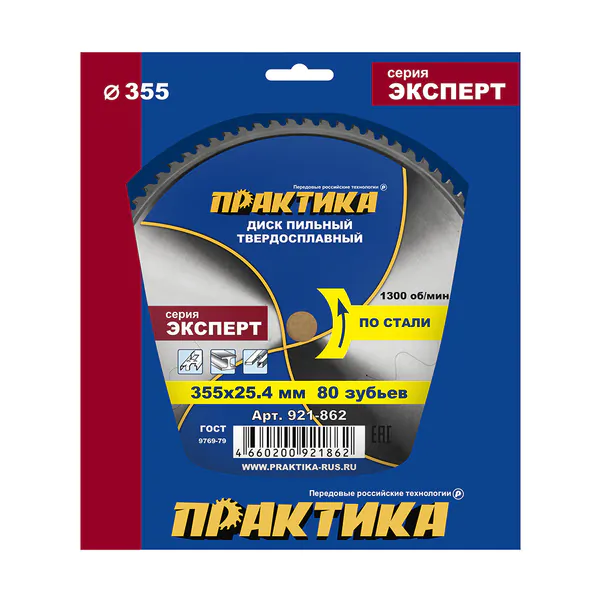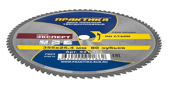 - • диск пильный по стали ПРАКТИКА 355*25,4 мм 80 зубьев 921-862.