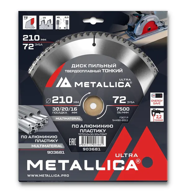 - • диск пильный тонкий твердосплавный по алюминию METALLICA Ultra 210*30/20/16 мм, 72 зуб, Т=2,2 мм, пласт 903681.