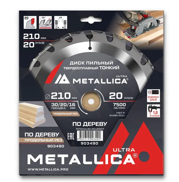 - • диск пильный тонкий твердосплавный по дереву METALLICA Ultra 210*30/20/16 мм, 20 зуб, Т=1,8 мм продольн. 903490.