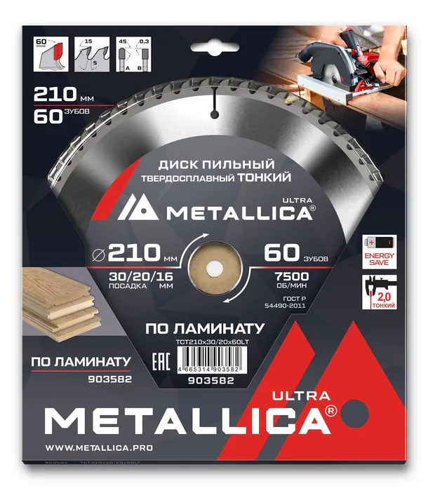 - • диск пильный тонкий твердосплавный по ламинату METALLICA Ultra 210*30/20/16 мм, 60 зуб, Т=2,0 мм 903582.