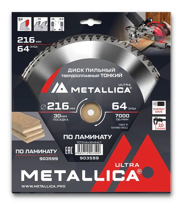 - • диск пильный тонкий твердосплавный по ламинату METALLICA Ultra 216*30 мм, 64 зуб, Т=2,0 мм 903599.