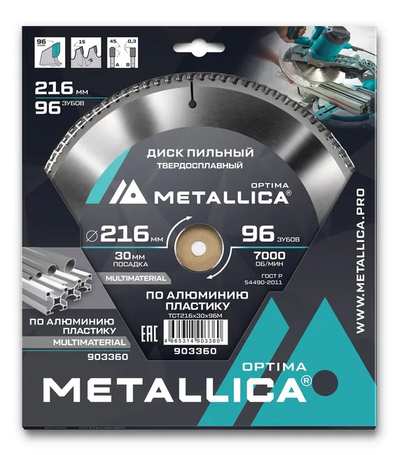 - • диск пильный твердосплавный по алюминию и пластику METALLICA Optima 216*30 мм, 96 зубов, Т=2,6 мм 903360.
