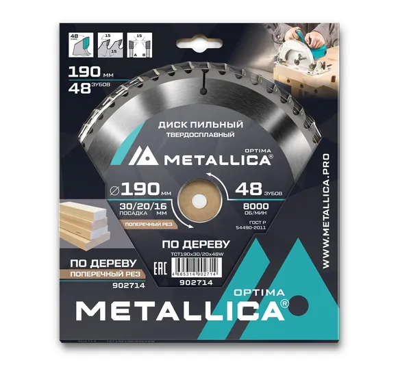 - • диск пильный твердосплавный по дереву METALLICA Optima 190*30/20/16 мм, 48 зубов, Т=2,4 мм поперечный 902714.