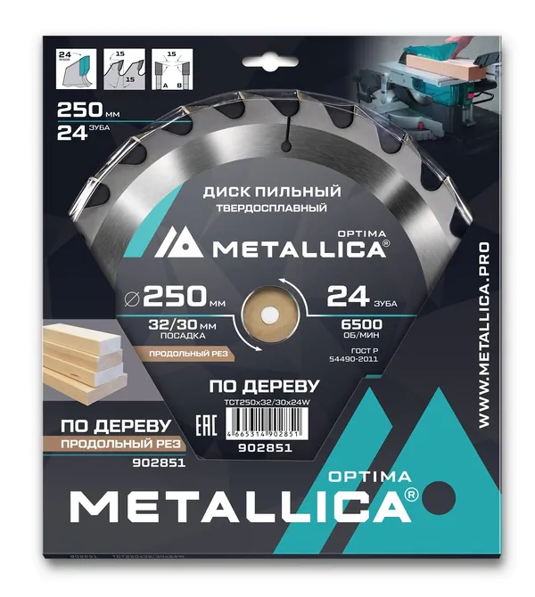 Диск пильный твердосплавный по дереву METALLICA Optima 250*32/30мм, 24 зуба, Т=3,0 мм продольный 902851