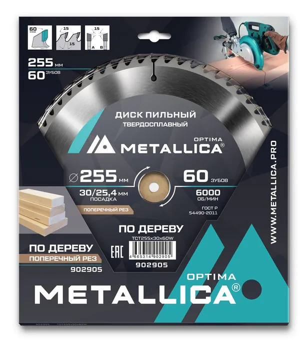 Диск пильный твердосплавный по дереву METALLICA Optima 255*30/25,4мм, 60 зубов, Т=3,0 мм поперечный 902905