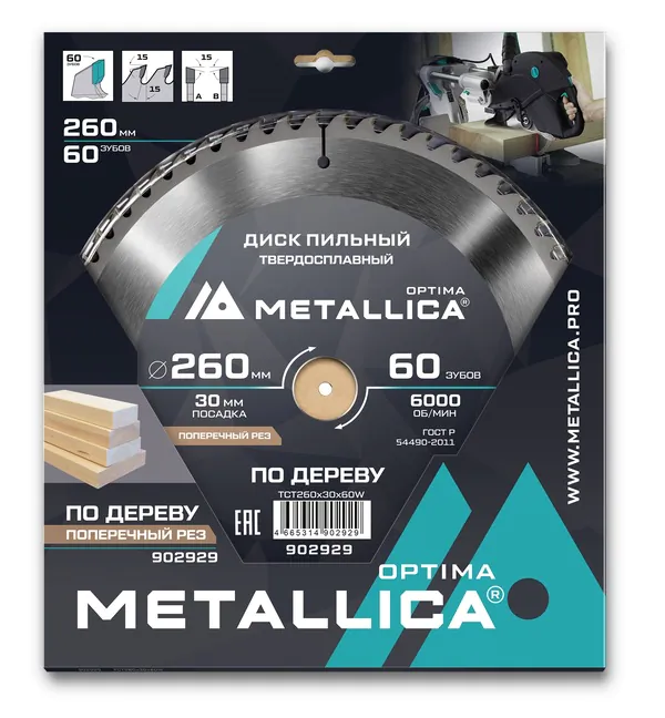 - • диск пильный твердосплавный по дереву METALLICA Optima 260*30 мм, 60 зубов, Т=3,0 мм поперечный 902929.