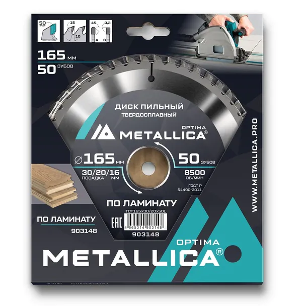 - • диск пильный твердосплавный по ламинату METALLICA Optima 165*30/20/16 мм, 50 зубов, Т=2,2 мм 903148.