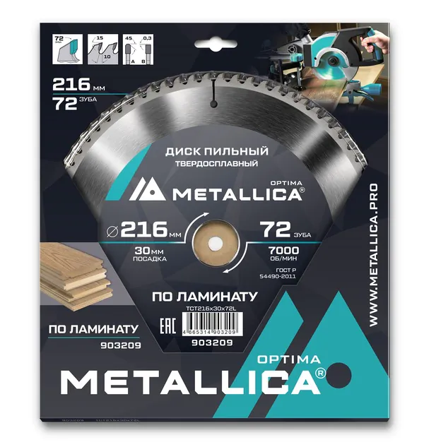 - • диск пильный твердосплавный по ламинату METALLICA Optima 216*30 мм, 72 зуба, Т=2,4 мм 903209.