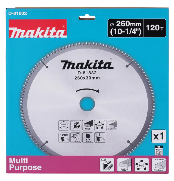 - • диск пильный универсальный Makita 260*30*2.6/1.8*120T (для алюминия/дерева/пластика) D-81832.