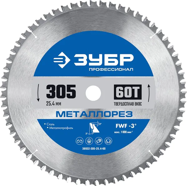 - ЗУБР Металлорез, 305 х 25.4 мм, 60Т, пильный диск по металлу и металлопрофилю, Профессионал (36932-305-25.4-60)