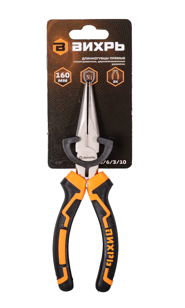 Длинногубцы прямые Вихрь, 160 мм, никелированные, двухкомпонентные рукоятки 73/6/3/10