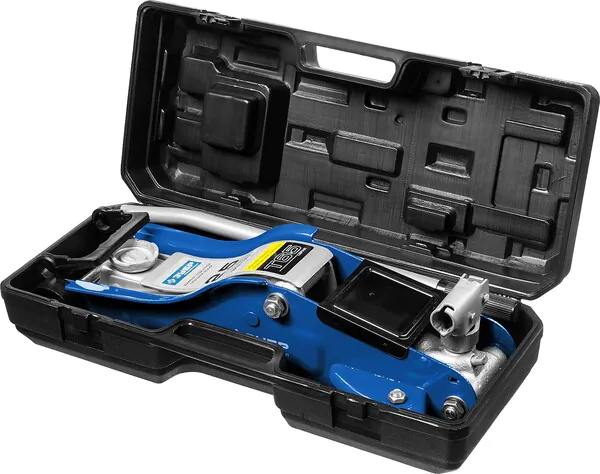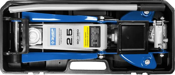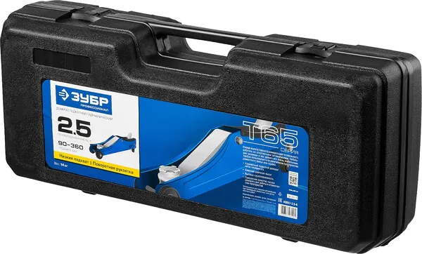 - ЗУБР Т-65, 2.5 т, 90 - 360 мм, подкатной домкрат с низким подхватом и поворотной ручкой в кейсе, Профессионал (43057-2.5-K)