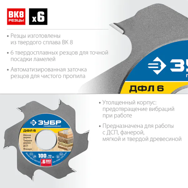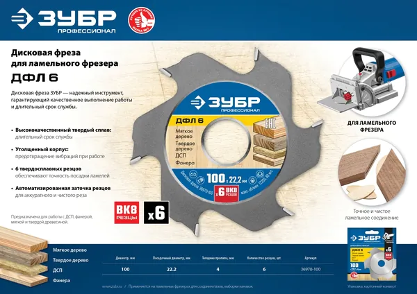 Фреза дисковая для ламельного фрезера Зубр Профессионал 100*22,2*6Т 36970-100