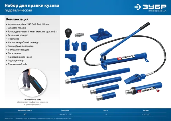 - ЗУБР 10 т, гидравлический набор для правки кузова в пластиковом кейсе, Профессионал (43035-10) 43035-10_z01