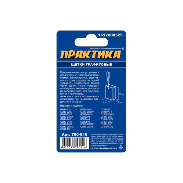 - • графитовая щетка Практика для Bosch 5*8*19мм (аналог 1617000525) 790-816.